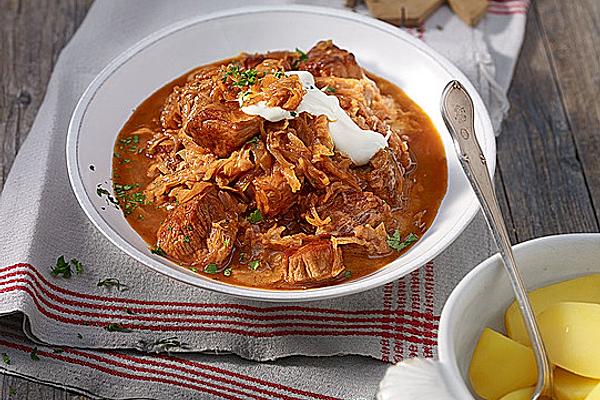 Sauerkraut, Fleisch und Speck zufügen, mit Paprika bestäuben, umrühren und knapp mit Brühe bedecken. Zugedeckt bei mittlerer Hitze ca. 1 Stunde schmoren, eventuell etwas Brühe nachgießen.