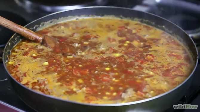 Zwiebel in einem großen Topf in etwas Öl glasig dünsten, Hack dazugeben und krümelig braten. Restliche Zutaten dazugeben, mit Taco-Gewürz (oder Salz, Pfeffer, Knoblauch, Kreuzkümmel, Koriander, Chilipulver) abschmecken und eine halbe Stunde simmern lassen.